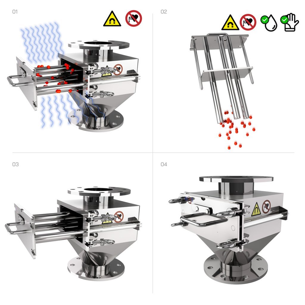 Podczas czyszczenia separatora magnetycznego zachowaj szczególną ostrożność; kraty magnetyczne i rdzenie magnetyczne po wyjęciu są bardzo silne, a ich przyciągnięcie do metalowych przedmiotów może spowodować urazy przez przyciśnięcie/ściśnięcie. Nie odkładaj ich na nic magnetycznego (stoły, ławy, policzki schodów, podłogi…). Uważaj także na gwałtowne przyciąganie się poszczególnych komponentów separatora magnetycznego do siebie podczas czyszczenia.