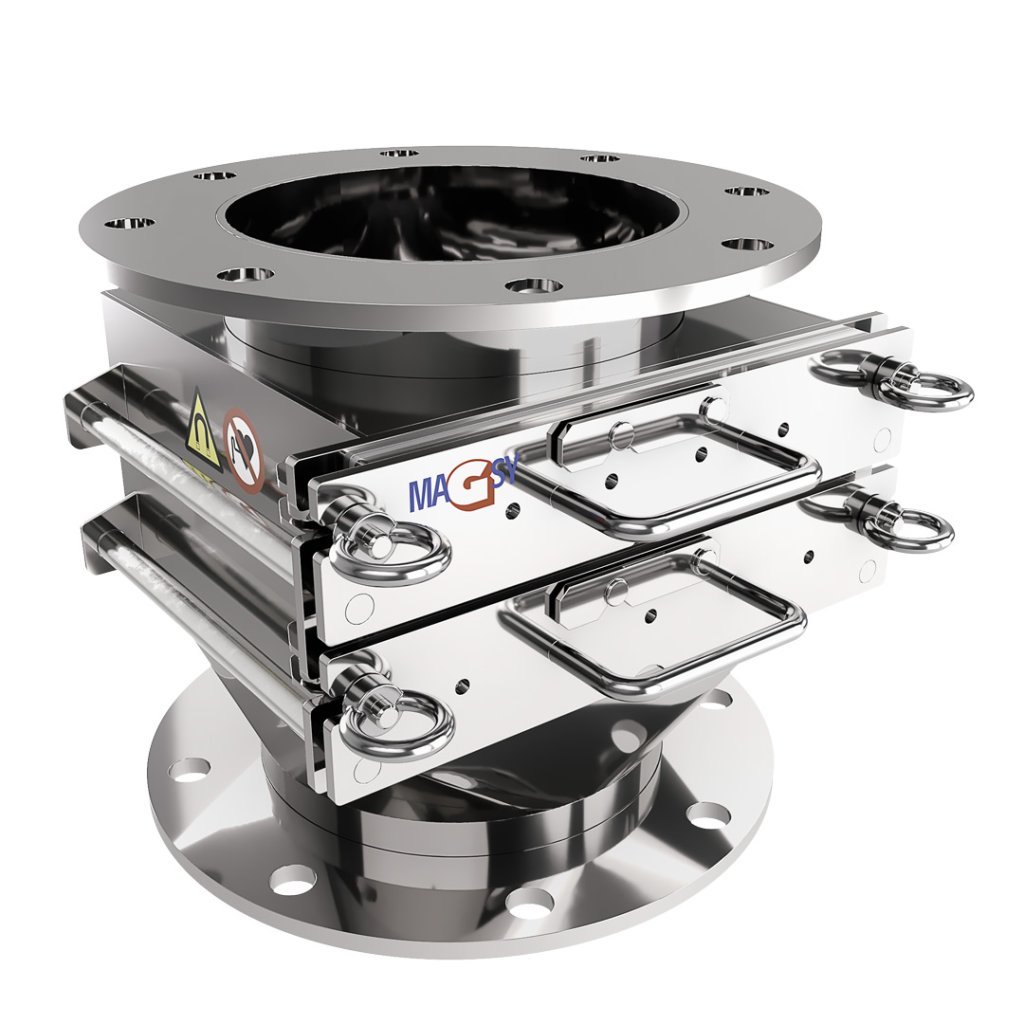 Wysuwny separator magnetyczny stosuje się jako etap wstępny do ochrony technologii tak, aby metalowe ferromagnetyczne zanieczyszczenia nie dostały się do urządzeń, które mogłyby uszkodzić, na przykład noże młynów, rozdrabniaczy, dysze linii regranulacji i granulacji, dysze wtryskarek, wytłaczarki, prasy, urządzenia do rozdrabniania, drobne sita, ceramiczne prasy, prasy szklarskie itp. Można go również użyć do oczyszczania mieszanki do możliwie najwyższej czystości, kiedy separator umieszcza się na końcu procesu produkcyjnego tuż przed pakowaniem i wysyłką, aby nie doszło do żadnej kontaminacji metalowym ferromagnetycznym materiałem podczas kolejnych operacji w zakładzie. W takim przypadku zakłada się natychmiastowe zamknięcie oczyszczanego materiału w zamykanych opakowaniach lub innych, zamykanych pojemnikach. Dzięki świetnie rozwiązanej konstrukcyjnie magnetycznej „labiryntowej” budowie, składającej się z pary rusztów umieszczonych jeden nad drugim, uzyskuje się wysoką skuteczność wychwytu zanieczyszczeń (prosimy dokładnie zapoznać się poniżej z opisem, jakie ferromagnetyczne metalowe zanieczyszczenia może wychwytywać ten separator magnetyczny).