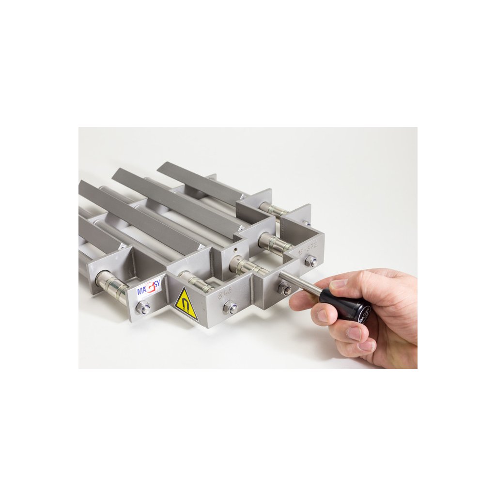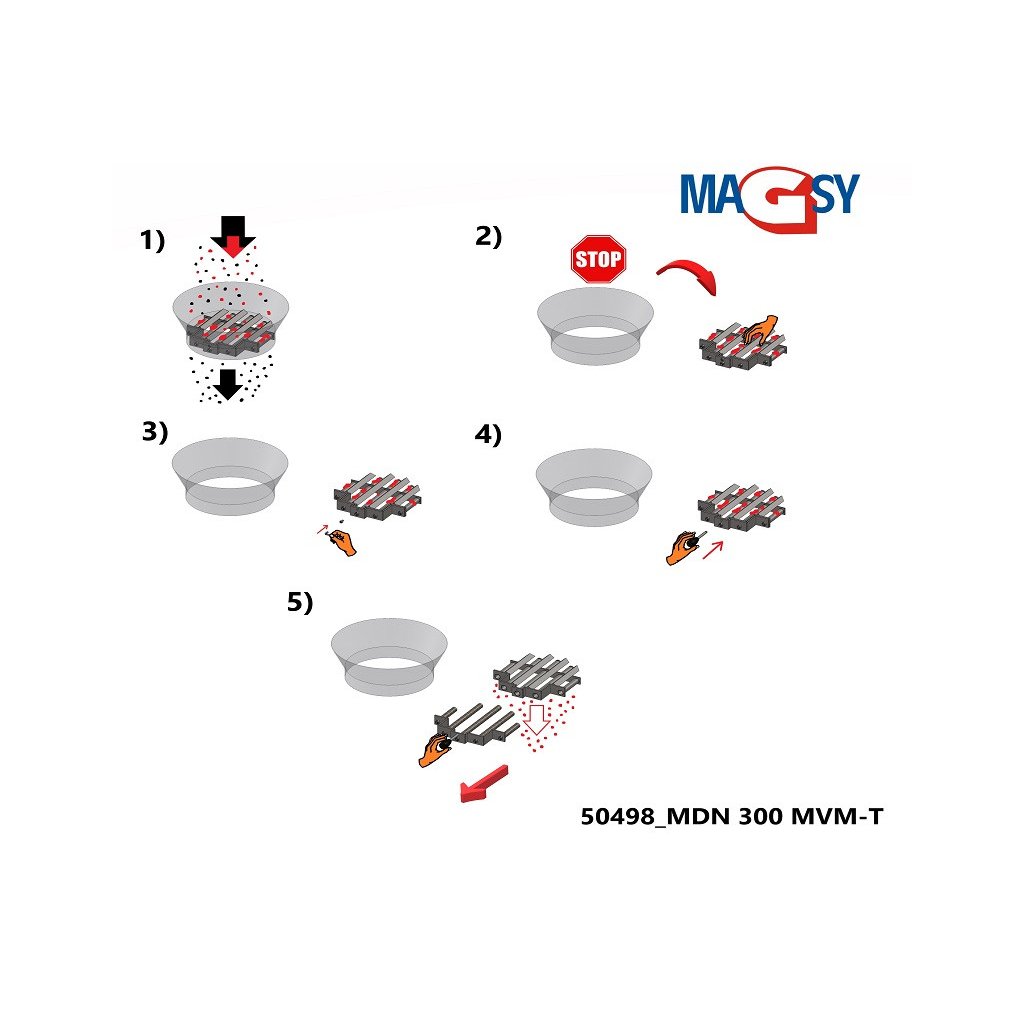 Magnes ten wychwytuje (oddziela) metalowe cząstki magnetyczne o wielkości od 1 µm i mniejsze (charakterystyczny ferromagnetyczny, niemierzalny pył magnetyczny) do rozmiaru 3 mm (3x3x3 mm), który jest maksymalną frakcją (rozmiarem) materiału, który może spaść na magnes do leja zasypowego i który może zostać przepuszczony przez niego. W rzadkich przypadkach magnes ten może również wychwytywać większe metalowe przedmioty o wielkości do 5 mm (5x5x5 mm). Zakłada się jednak, że zanieczyszczenia te będą występować losowo do maksymalnie 1% całkowitej godzinowej wydajności przesiewanego materiału (zakłada się, że ruszt magnetyczny jest regularnie czyszczony z zanieczyszczeń ferromagnetycznych, co nie oznacza, że cały 1% większych zanieczyszczeń ferromagnetycznych może pozostać na ruszcie leja zasypowego przez cały czas trwania godzinowej wydajności przesiewanego materiału). Zawartość większych zanieczyszczeń ferromagnetycznych nie może być wyższa. Jeśli zawartość większych zanieczyszczeń ferromagnetycznych w materiale jest wyższa, nie należy używać tegu typu rusztu magnetycznego i należy skontaktować się z naszym działem techniczno-handlowym, w celu uzyskania fachowej porady.