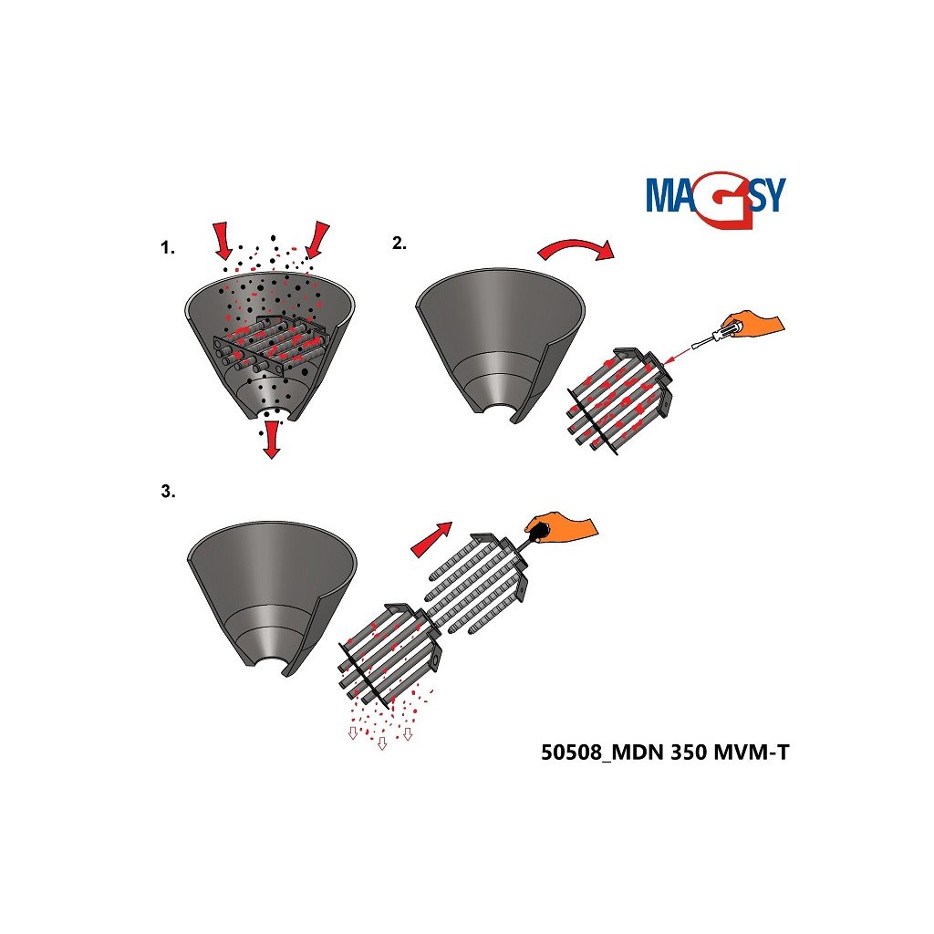 Magnes nie może być uderzany przez obiekty większe niż określone przez nas (maks. średnica 3 mm, 3x3x3 mm), z wyjątkiem zanieczyszczeń ferromagnetycznych, które opisujemy powyżej w losowych ilościach. W przypadku obawy o obecność większych zanieczyszczeń ferromagnetycznych lub innych, konieczne jest wstępne ustawienie sita o rozmiarze oczek maks. 3 mm, aby te większe, niepożądane obiekty zostały złapane przed wejściem do leja zasypowego (po zainstalowaniu sita należy rozważyć zmniejszenie obciążenia pojemnościowego, przepuszczalności magnesu do leja zasypowego). Sito nie jest zawarte w zakresie dostawy magnesu do leja zasypowego. Należy również pamiętać, że materiał może zawierać duże ilości drobnych zanieczyszczeń metalicznych (bardzo drobny metaliczny pył magnetyczny o wielkości poniżej 1 µm), które mogą pokryć rury magnetyczne i sprawidć, że ruszt magnetyczny stanie się bezużyteczny (drobne cząstki magnetyczne również gromadzą się w materiale zbiornika i przytłaczają cały system). Jednocześnie siła magnetyczna/wydajność magnesu w zbiorniku jest znacznie zmniejszona. Jeśli rury magnetyczne natychmiast po rozpoczęciu przepuszczania materiału przez magnes leja zasypowego zostaną pokryte i "ukryją się" całkowicie w żelaznym pyle, nie jest to wada magnesu do leja zasypowego, ale należy wzmocnić separację magnetyczną za pomocą innego separatora magnetycznego lub częściej czyścić magnes do leja zasypowego, ponieważ materiał prawdopodobnie zawiera bardzo dużą ilość cząstek ferromagnetycznych.