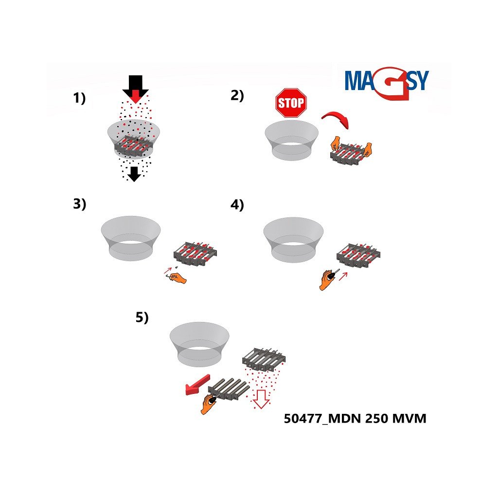 Magnes nie może być uderzany przez obiekty większe niż określone przez nas (maks. średnica 3 mm, 3x3x3 mm), z wyjątkiem zanieczyszczeń ferromagnetycznych, które opisujemy powyżej w losowych ilościach. W przypadku obawy o obecność większych zanieczyszczeń ferromagnetycznych lub innych, konieczne jest wstępne ustawienie sita o rozmiarze oczek maks. 3 mm, aby te większe, niepożądane obiekty zostały złapane przed wejściem do leja zasypowego (po zainstalowaniu sita należy rozważyć zmniejszenie obciążenia pojemnościowego, przepuszczalności magnesu do leja zasypowego). Sito nie jest zawarte w zakresie dostawy magnesu do leja zasypowego. Należy również pamiętać, że materiał może zawierać duże ilości drobnych zanieczyszczeń metalicznych (bardzo drobny metaliczny pył magnetyczny o wielkości poniżej 1 µm), które mogą pokryć rury magnetyczne i sprawidć, że ruszt magnetyczny stanie się bezużyteczny (drobne cząstki magnetyczne również gromadzą się w materiale zbiornika i przytłaczają cały system). Jednocześnie siła magnetyczna/wydajność magnesu w zbiorniku jest znacznie zmniejszona. Jeśli rury magnetyczne natychmiast po rozpoczęciu przepuszczania materiału przez magnes leja zasypowego zostaną pokryte i "ukryją się" całkowicie w żelaznym pyle, nie jest to wada magnesu do leja zasypowego, ale należy wzmocnić separację magnetyczną za pomocą innego separatora magnetycznego lub częściej czyścić magnes do leja zasypowego, ponieważ materiał prawdopodobnie zawiera bardzo dużą ilość cząstek ferromagnetycznych.